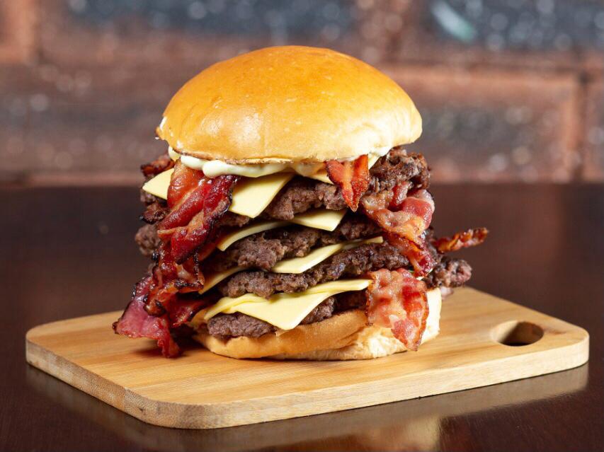 Para corajosos! Pão brioche, maionese caseira, 4x burger smash 80 g, 4x american cheese e 4x bacon.